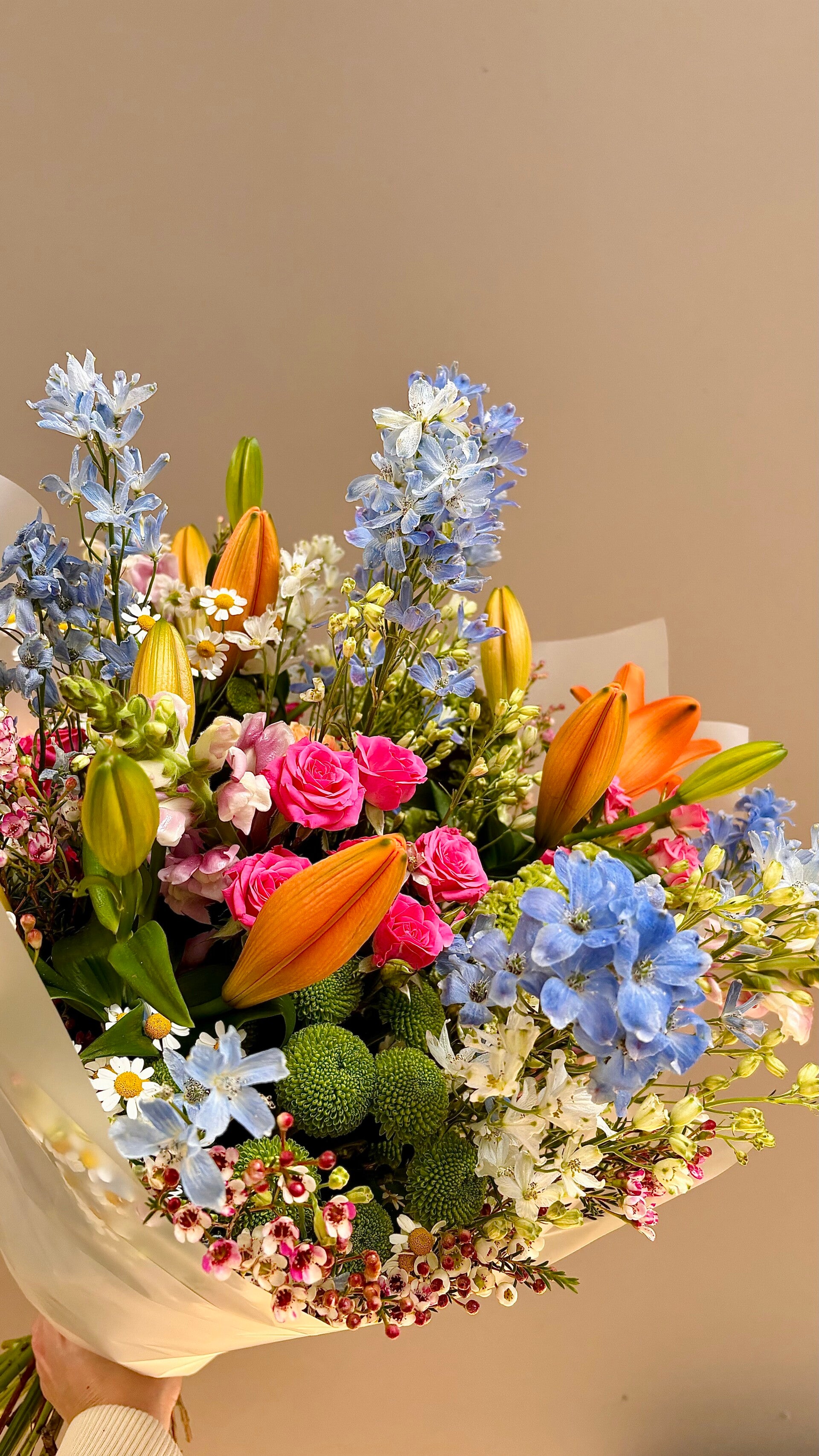 Een speels en kleurrijk boeket, gevuld met verschillende veldbloemen.